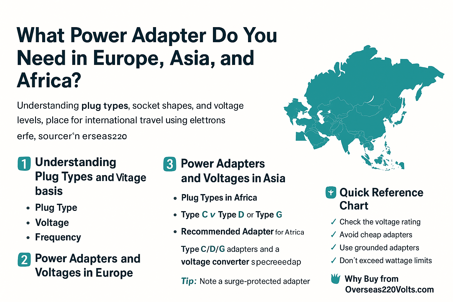 At Overseas220Volts.com, we specialize in providing reliable adapters, converters, and transformers that make your international travel hassle-free. In this comprehensive guide, we’ll explain the plug types, voltage differences, and best adapters for Europe, Asia, and Africa — helping you power your devices safely and efficiently.